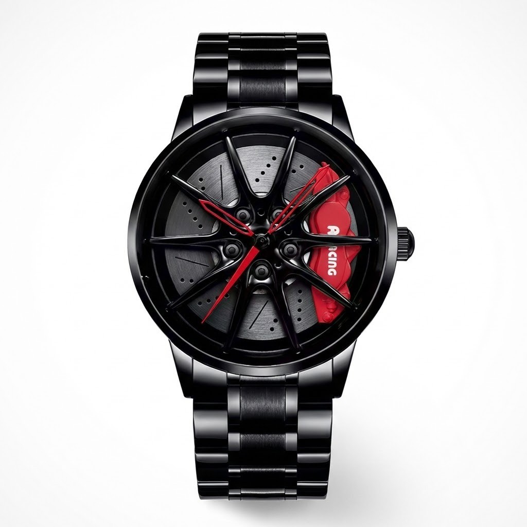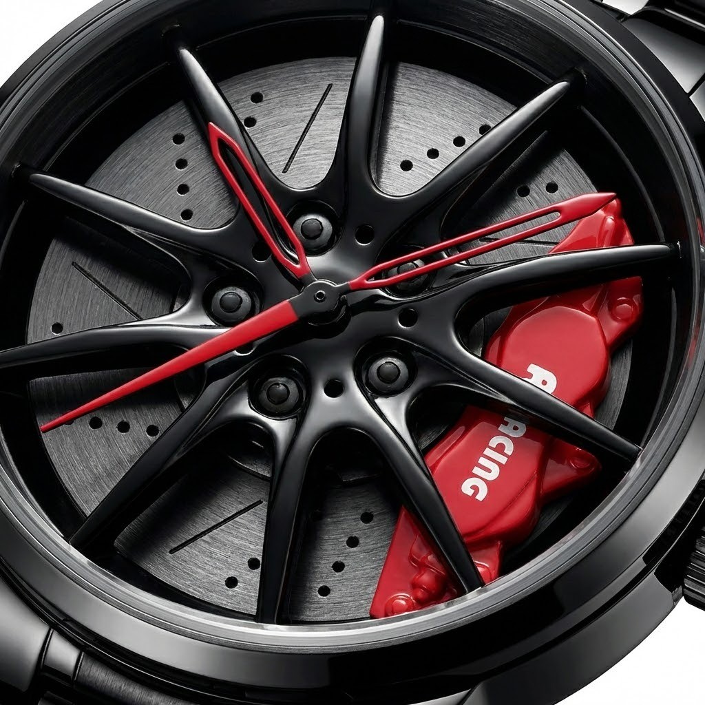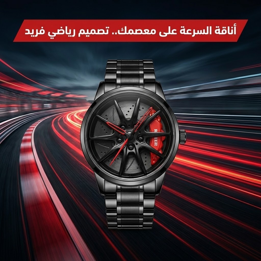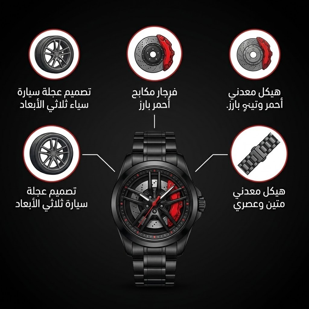🎡 قرص الإطار ثلاثي الأبعاد (3D Hub): يتميز المينا بتصميم واقعي مذهل يحاكي "جنوط" وعجلات السيارات الرياضية، مع تفاصيل دقيقة لمكابح الديسك (Brembo Style) التي تمنح الساعة عمقاً بصرياً يلفت الأنظار من الوهلة الأولى.