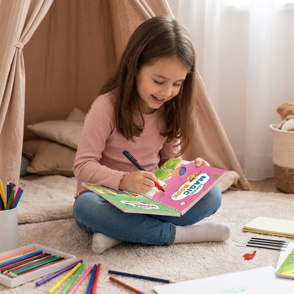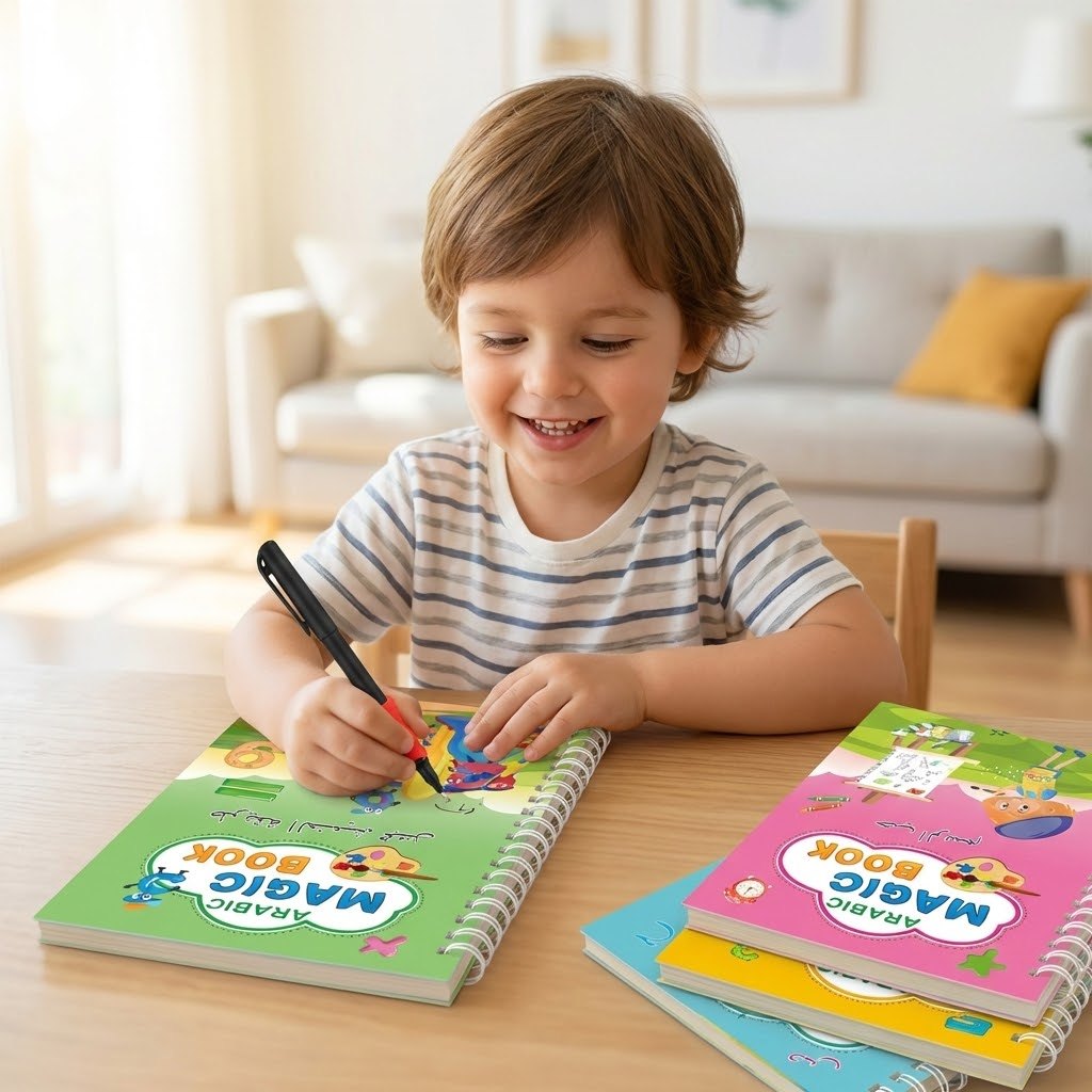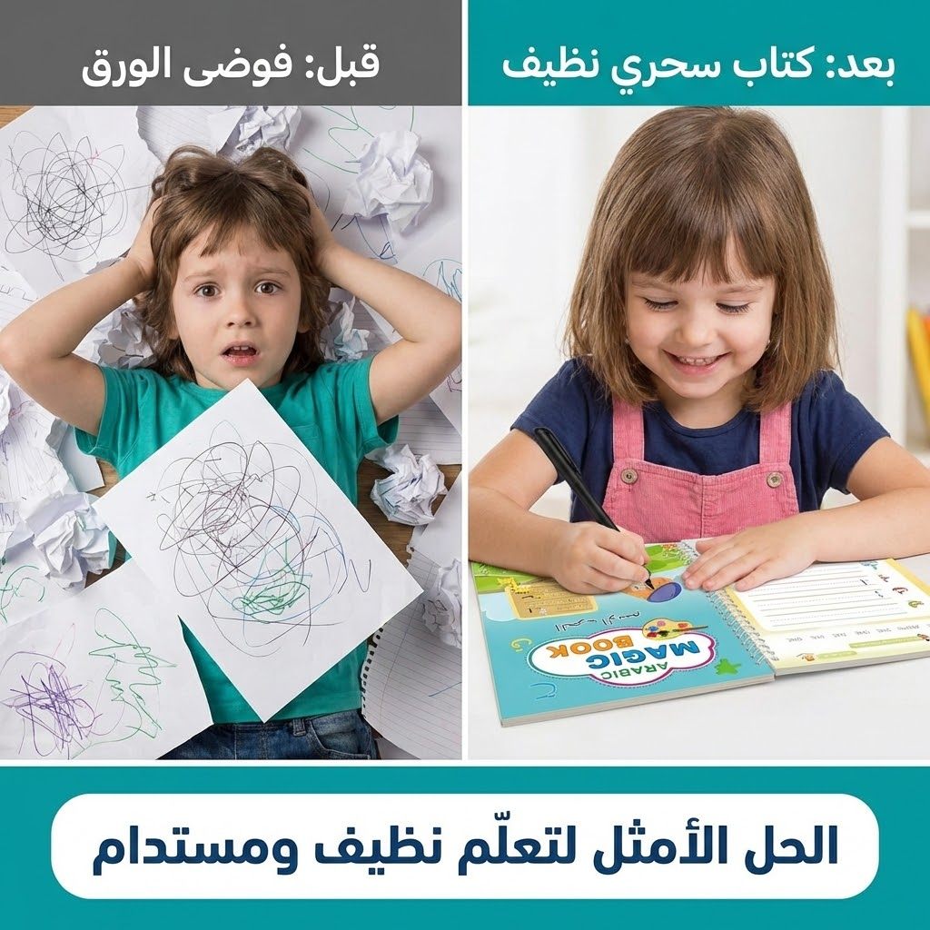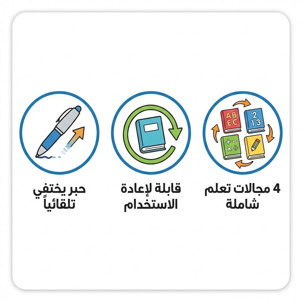 🪄 تقنية "الحبر المختفي" المذهلة: يأتي مع المجموعة قلم سحري يختفي حبره تلقائياً بعد حوالي 10 إلى 20 دقيقة من الكتابة، مما يسمح للطفل بإعادة استخدام الصفحات آلاف المرات دون الحاجة لشراء دفاتر جديدة.