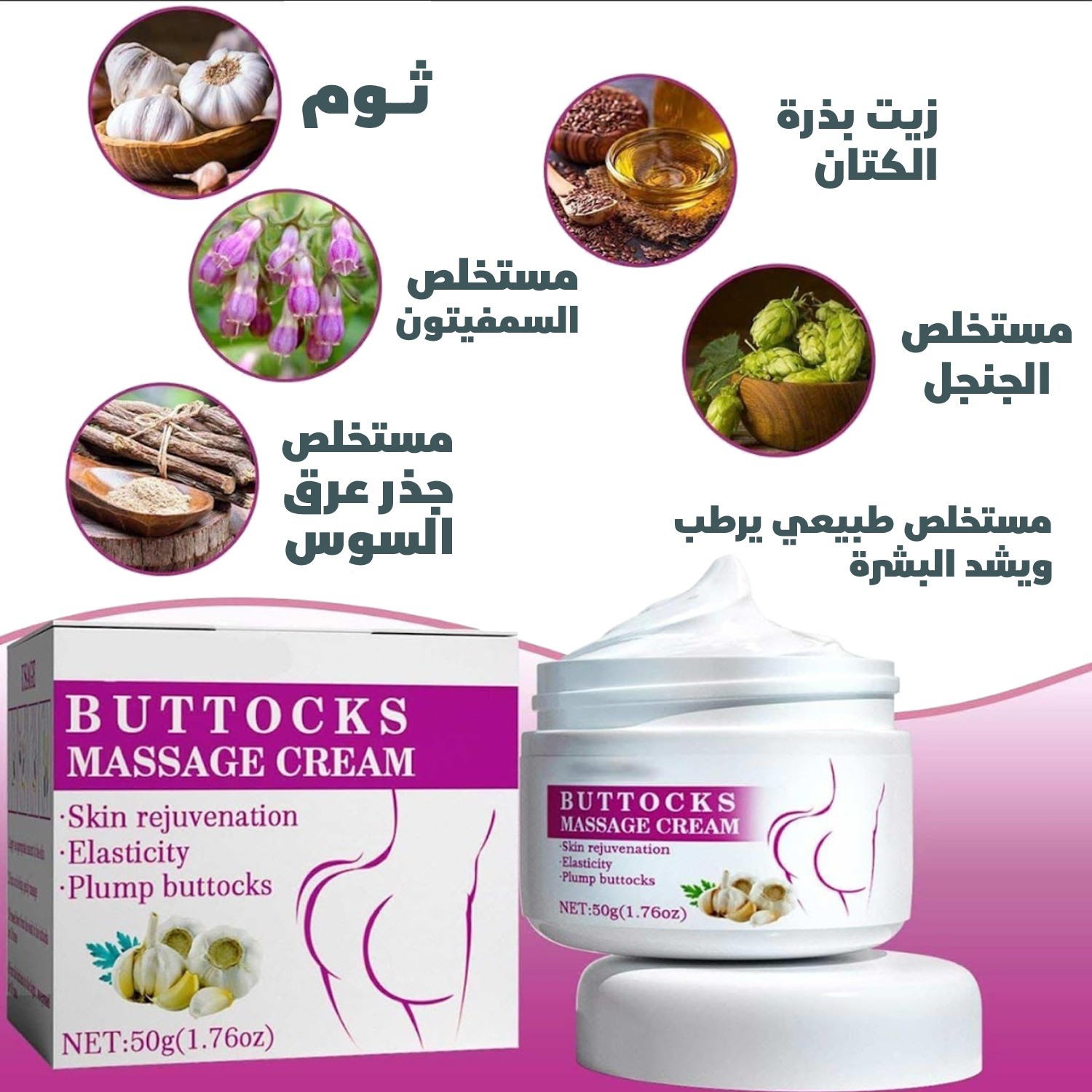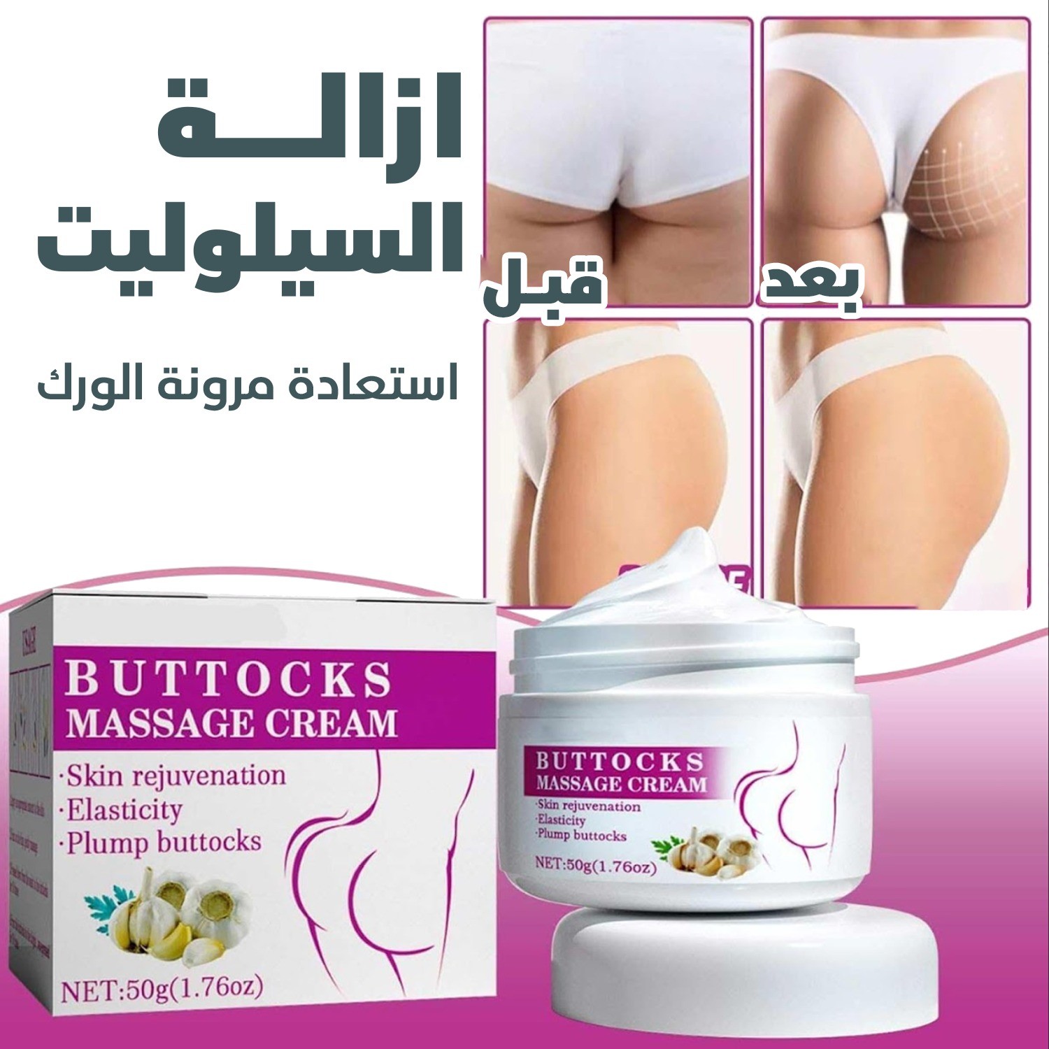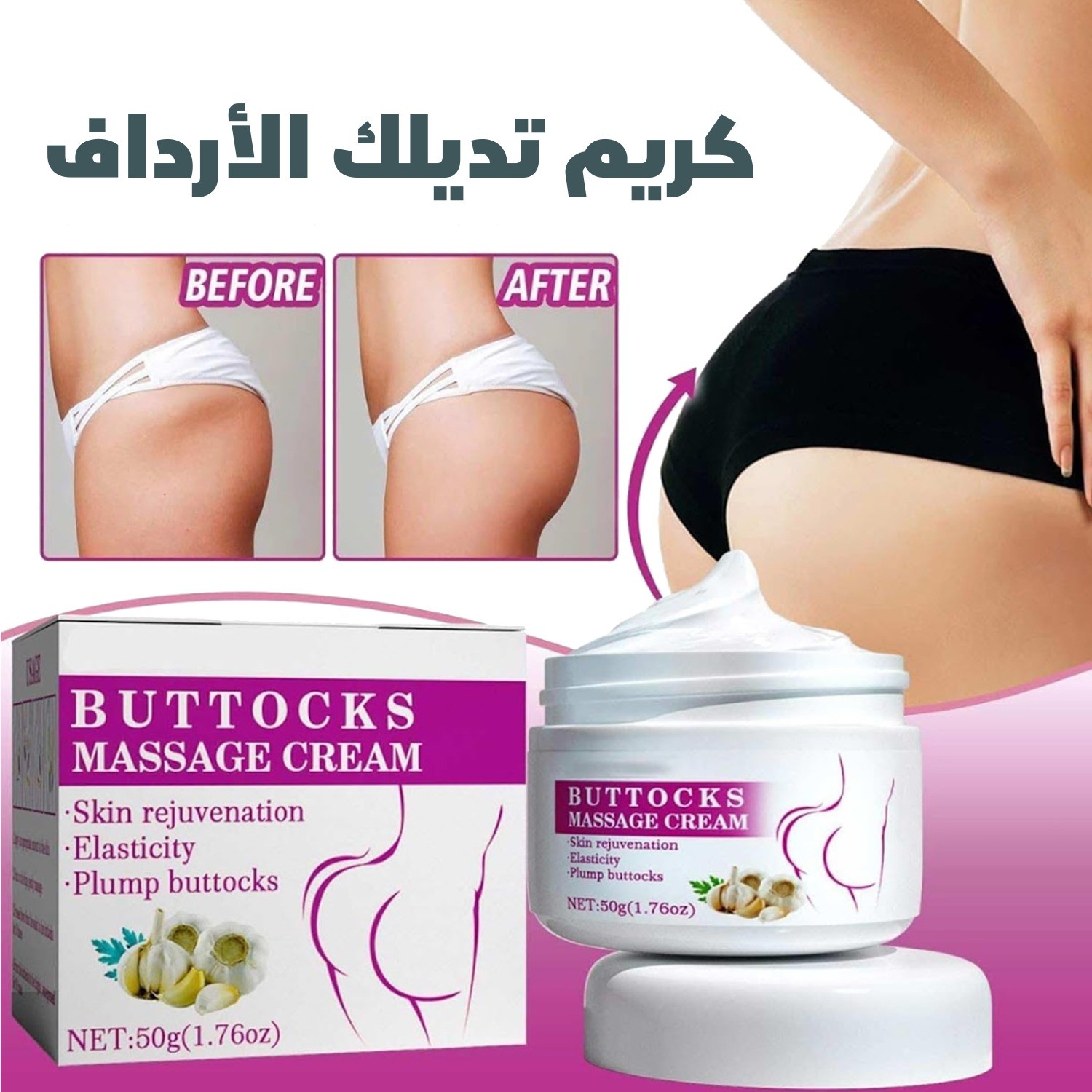 احصلي على مؤخرة ممتلئة، مشدودة وناعمة مع كريم الثوم لتكبير الأرداف. تركيبة مبتكرة غنية بمستخلصات طبيعية تساعد على رفع الأرداف ومنحها شكلًا مثاليًا وجذابًا.