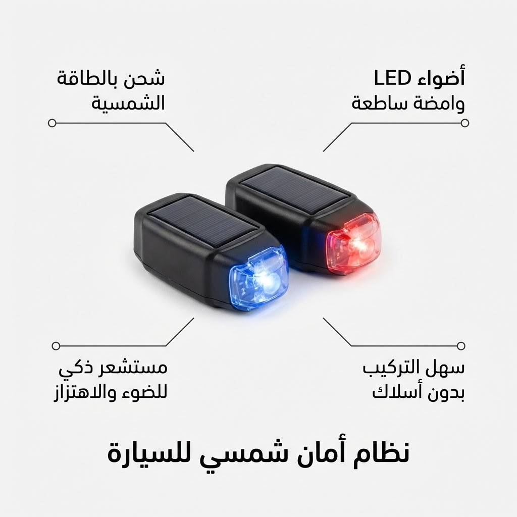 احمِ سيارتك بأسلوب مبتكر مع ضوء التحذير الشمسي LED مع إنذار وهمي. هذا الجهاز يعمل بالطاقة الشمسية بالكامل، ما يجعله صديقًا للبيئة ويوفر الطاقة دون الحاجة للبطاريات. يتميز بتصميمه اللاسلكي وسهولة التركيب على أي سطح سيارة، ويقوم بإصدار وميض مستمر يحاكي الإنذار الواقعي، ليُخيف أي لص ويمنحك راحة البال. ليس مجرد أداة حماية، بل أيضًا إضافة جمالية لسيارتك مع لمسة تقنية حديثة.
