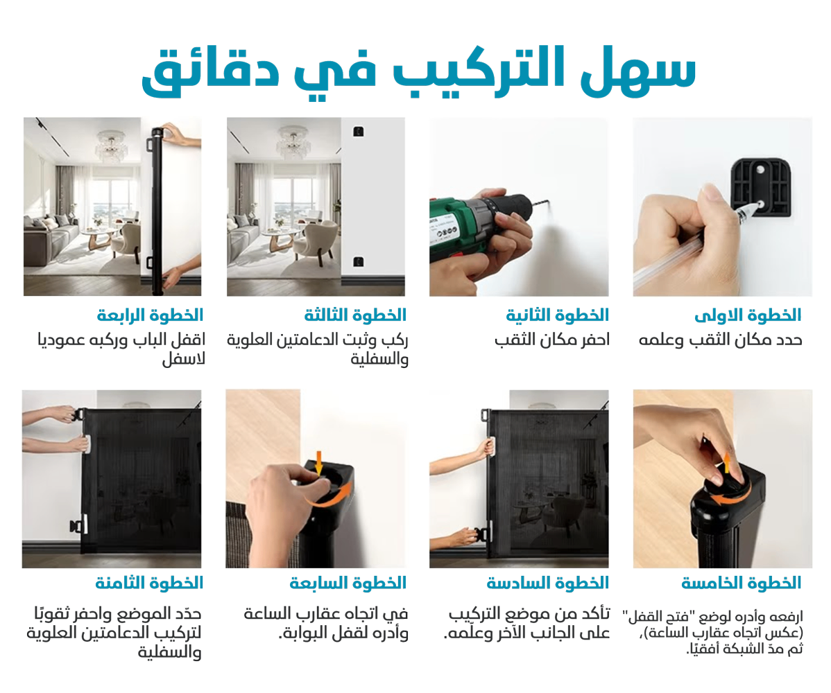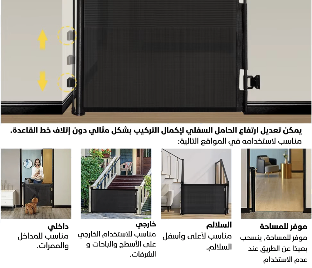 يمكن استخدامها في أي مكان، على الأبواب، أو الأدراج، أو بين الحوائط، لحماية طفلك من خطر السقوط والتحرك في الأماكن التي قد تكون خطرة عليه.