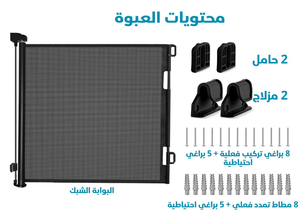 يأتي مع 6 قطع من الخطافات للتثبيت، وحامل معدني واحد. تشتمل هذه المجموعة على خطاف لاصق لسهولة التركيب والتثبيت. لا يتطلب أي أدوات أخرى لتركيب السياج.