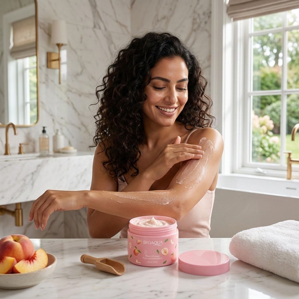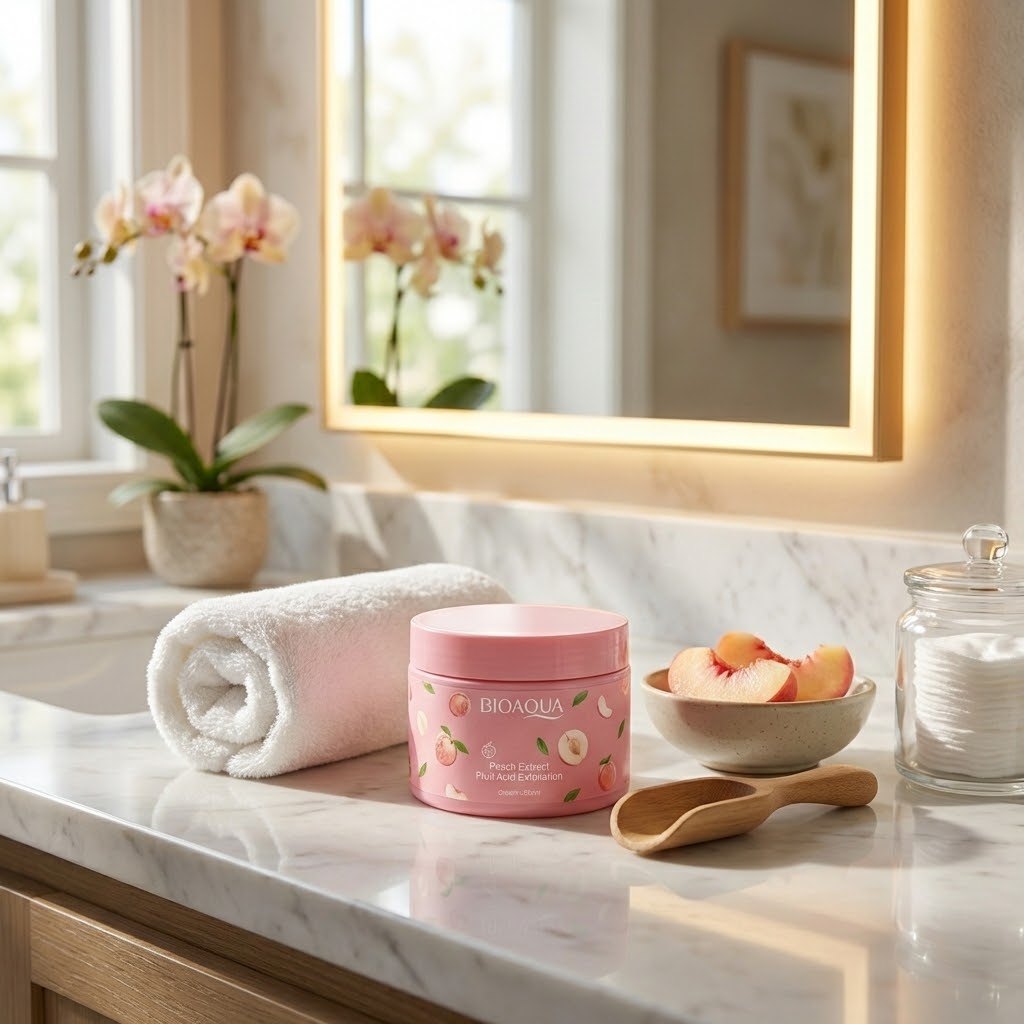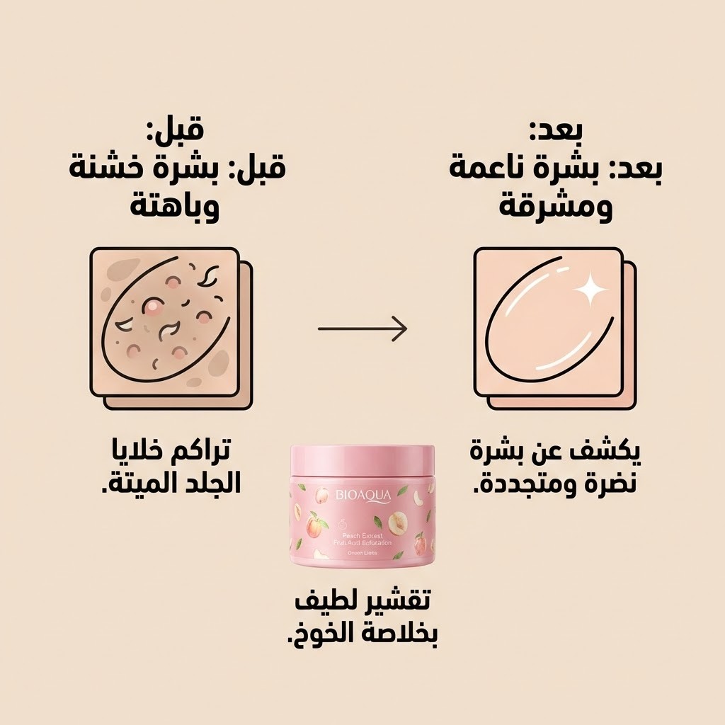 💧 ترطيب "حبّات الخوخ": خلاصة الخوخ غنية بالفيتامينات التي تعوض البشرة عن الرطوبة المفقودة أثناء التقشير، مما يمنع الشعور بالشد أو الجفاف ويترك ملمساً ناعماً كالحرير.