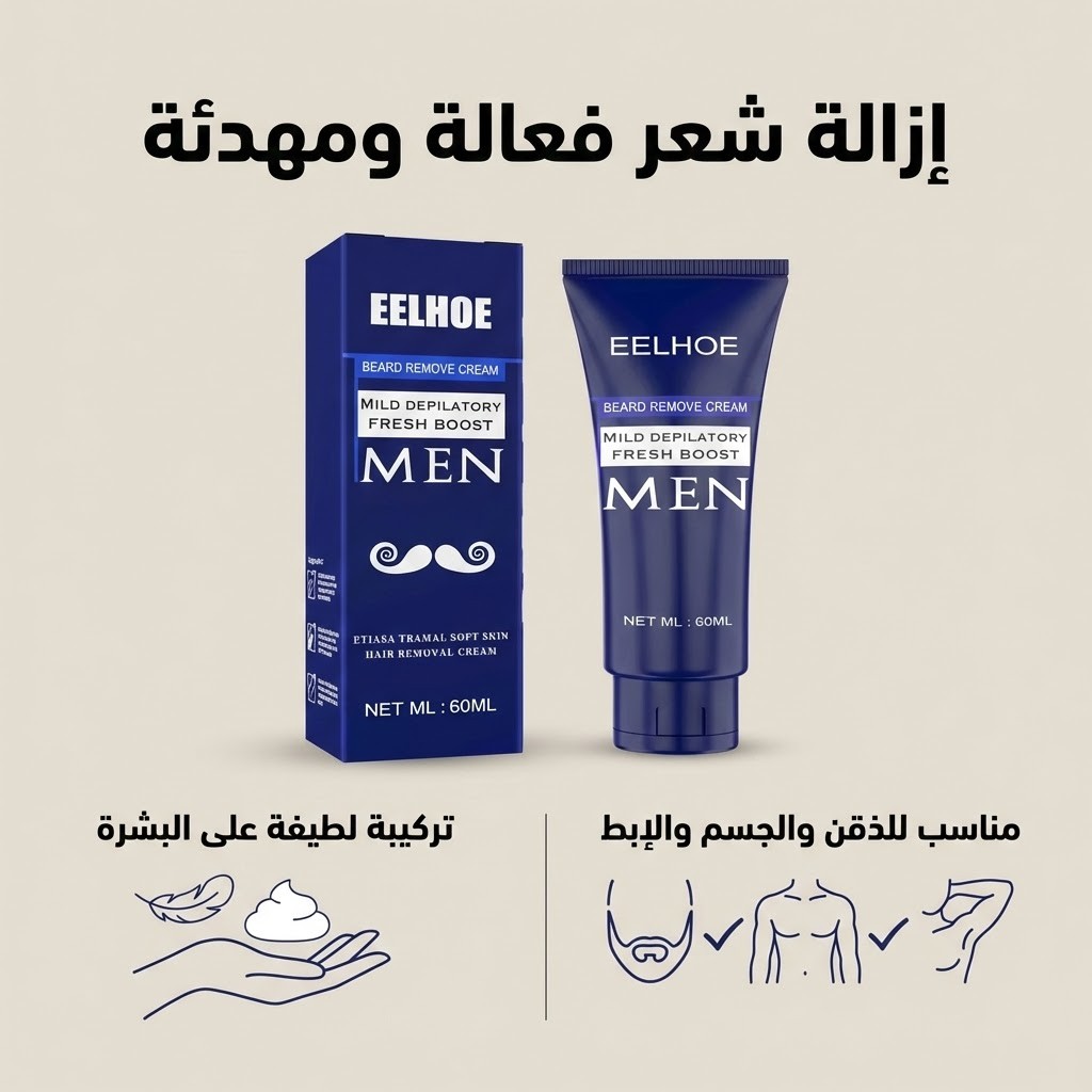 استمتع ببشرة ناعمة ونظيفة مع كريم إزالة الشعر الرجالي المصمم خصيصًا لإزالة الشعر غير المرغوب فيه من اللحية، الجسم، والإبطين بسهولة وأمان.