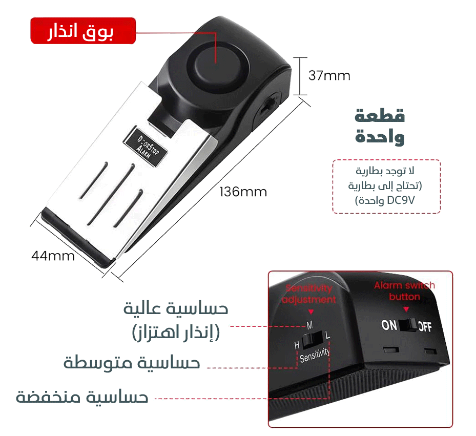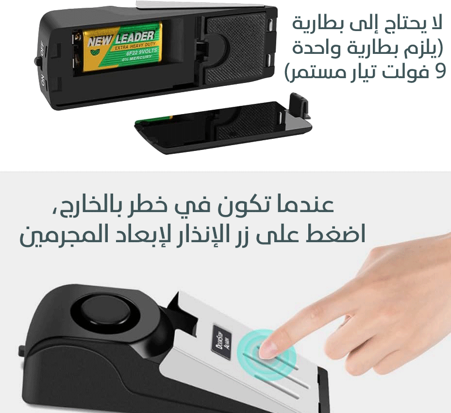 يعمل الجهاز على إصدار صوت إنذار عالي فور الضغط على الباب أو تحريكه، مما يساعد على ردع المتسللين وتنبيه الموجودين داخل المكان بسرعة.