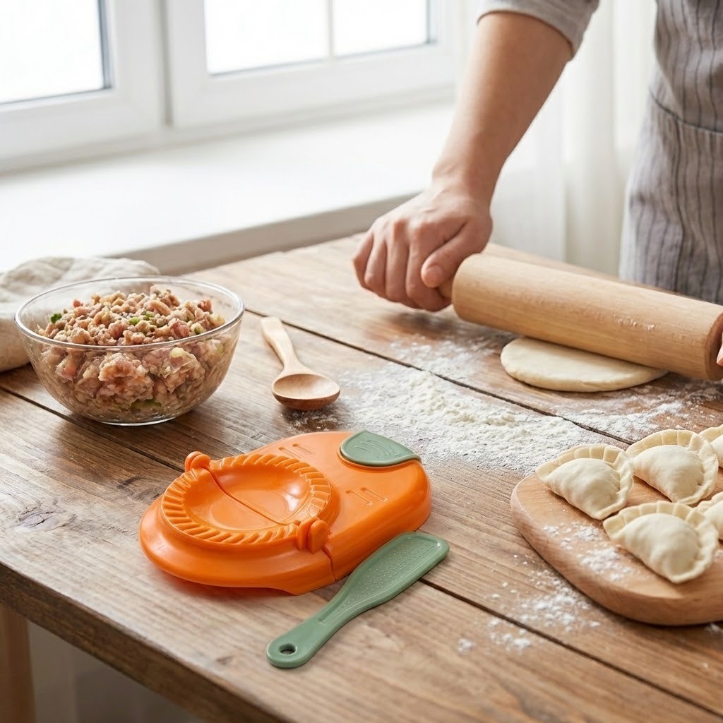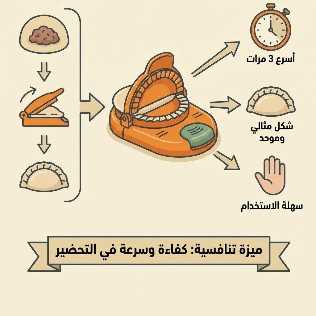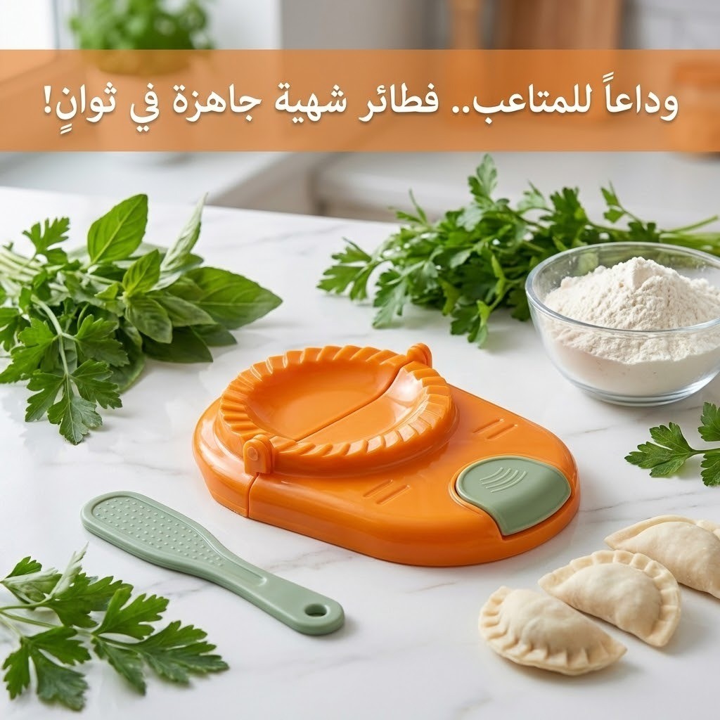 ⚙️ نظام الحركة المزدوجة (فرد + إغلاق): لا داعي لاستخدام أدوات متعددة؛ الجزء الأول من الجهاز يقوم بفرد العجين للحصول على دوائر مثالية ومتساوية، بينما يقوم الجزء الثاني بإغلاقها بإحكام حول الحشوة بضغطة واحدة بسيطة.