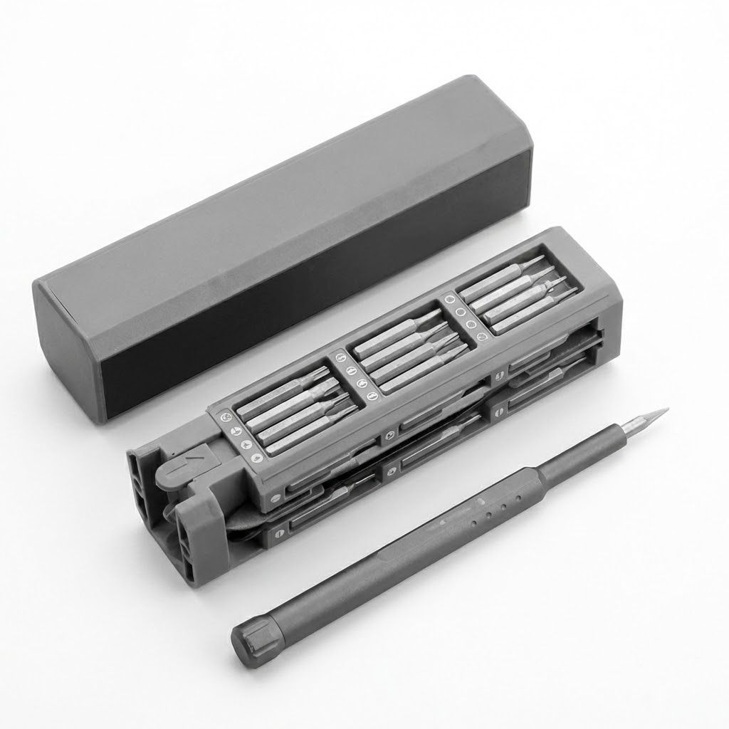 مجموعة مفكات براغي دقيقة وشاملة بدرجة احترافية 46 في 1 مصممة للإصلاح والصيانة الدقيقة للأجهزة الإلكترونية الحديثة. صُممت هذه المجموعة برؤوس متينة من سبائك فولاذ S2، وتوفر جميع الأدوات اللازمة للتعامل مع الإصلاحات المعقدة للهواتف المحمولة وأجهزة الكمبيوتر المحمولة وأجهزة الكمبيوتر والساعات والمزيد. تتميز المجموعة بمقبض قوي ومريح (غالباً ما يكون بغطاء دوار لتحقيق الكفاءة) وجميع الرؤوس مغناطيسية لمنع فقدان البراغي الصغيرة. توجد هذه المجموعة متعددة الاستخدامات في علبة مدمجة ومنظمة، وهي ضرورية لكل من الفنيين المحترفين وعشاق الأعمال اليدوية، مما يضمن حصولك دائماً على الرأس الصحيح للمهمة.