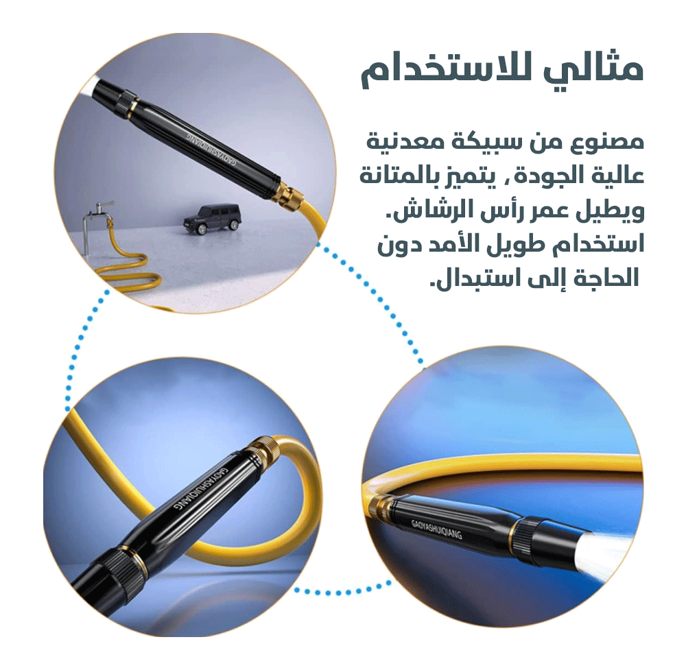 🚗 رفيقك المثالي في كل مكان: أداة متعددة المهام بامتياز؛ استخدمه لغسيل سيارتك ومنحها لمعان الوكالة، أو لتنظيف جدران المنزل والأفنية، وحتى لري حديقتك بذكاء بفضل ميزة التحكم في شكل التدفق.