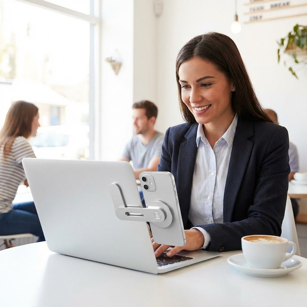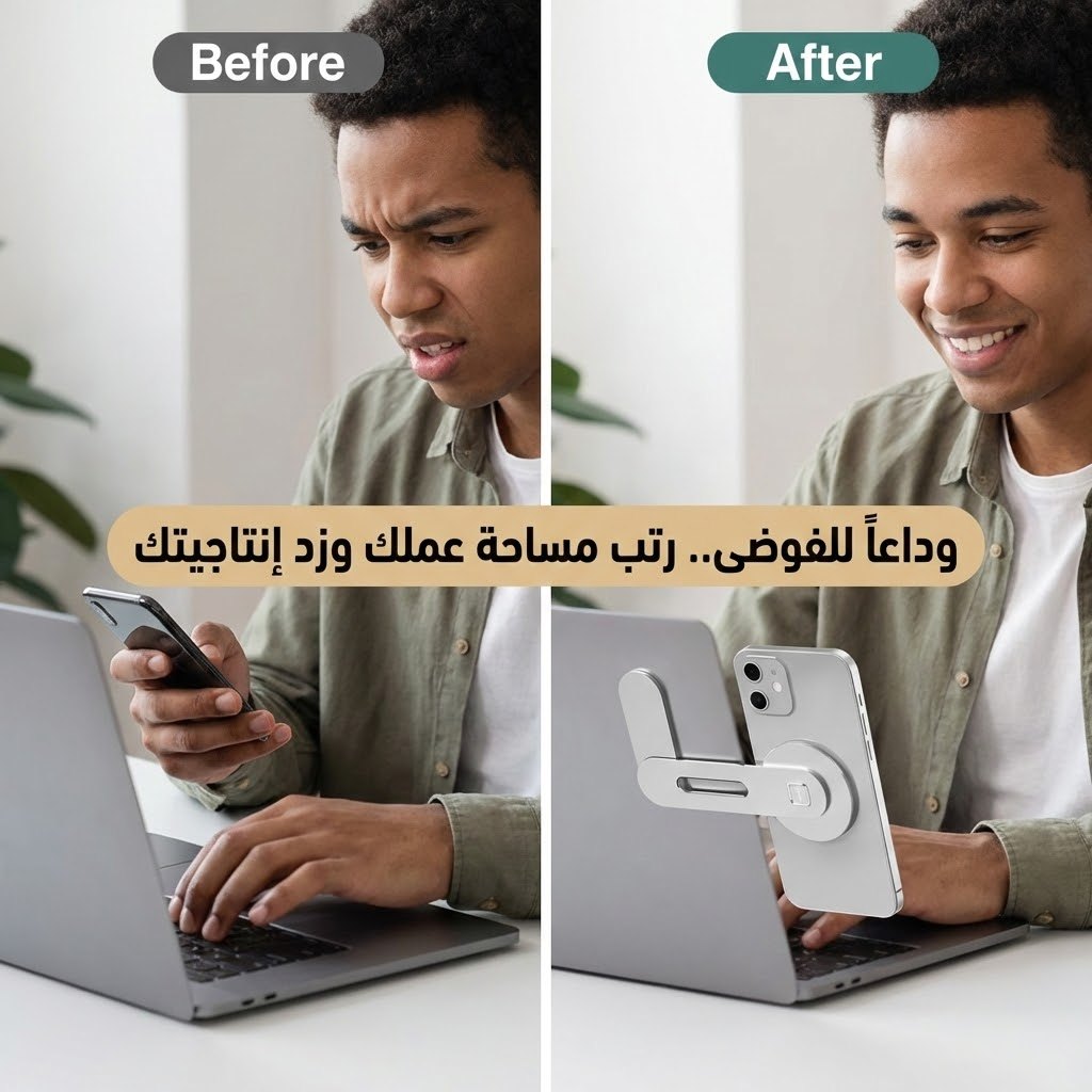🛡️ حماية العمود الفقري (Ergonomic Design): من خلال رفع الهاتف إلى مستوى العين بجانب شاشة اللابتوب، يقلل الحامل من حركة الرأس المتكررة للأسفل، مما يخفف الضغط على الفقرات العنقية ويمنع آلام الرقبة الناتجة عن العمل الطويل.
