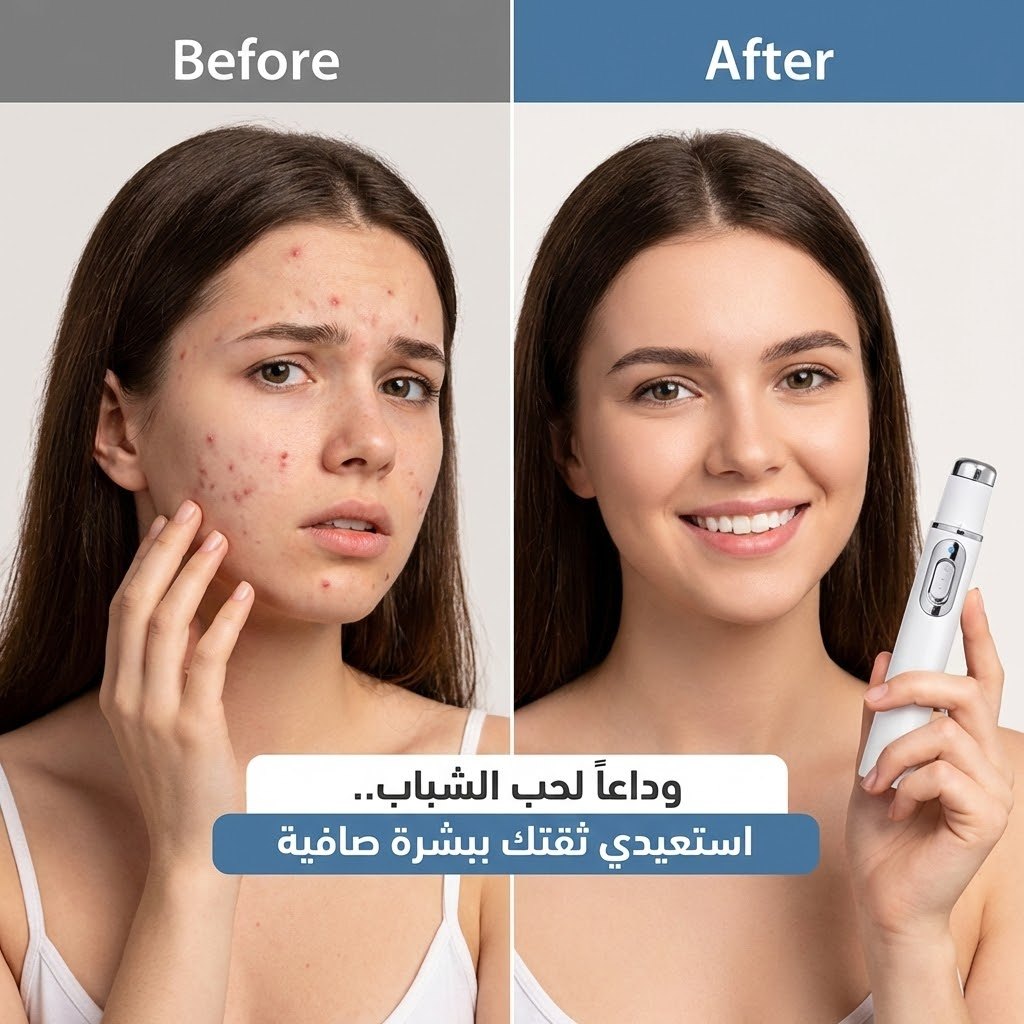 🔹 تقنية الضوء الأزرق (415 نانومتر): يعمل هذا الطول الموجي الدقيق كمضاد بكتيري قوي؛ حيث يتغلغل داخل المسام للقضاء على البكتيريا المسببة لحب الشباب، مما يمنع ظهور بثور جديدة ويجفف الحالية بفعالية مذهلة.